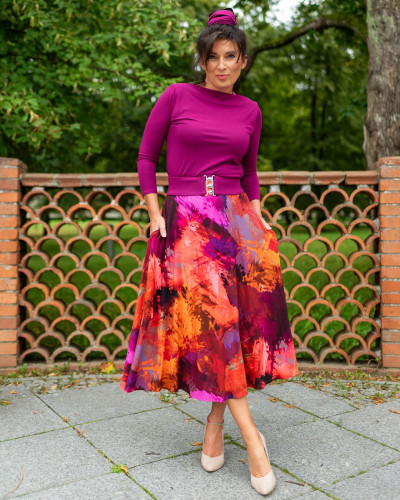 Spódnica  RETROspekcja ROZKLOSZOWANA, ale nie z pełnego koła, posiada kieszenie, szeroki pas. SKŁAD: 95% wiskoza, 5% elastan Gramatura...